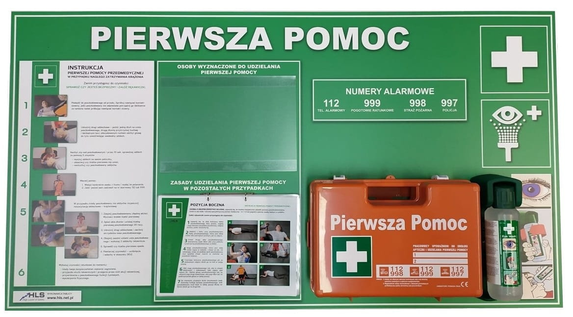 TABLICA PIERWSZEJ POMOCY dla firm – z miejscem na apteczkę i płukankę do oczu